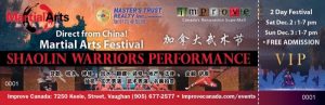 为响应“一带一路”,弘扬中华文化,加强中加友谊,以武会友,让中华武术在与世界武术交流中进步,让更多的多伦多市民了解中国少林武术。加拿大武艺会 聯合加拿大最大家居商城 Improve Canada 隆重推出加拿大武術節: 少林功夫﹐硬氣功﹐和其它國際武術形式 精彩表演。 門票免費。